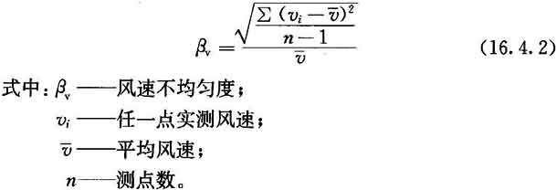 16.4.2 當(dāng)需對(duì)室內(nèi)單向流品質(zhì)作細(xì)致確認(rèn)時(shí),可測(cè)工作區(qū)(或規(guī)定高度)截面風(fēng)速不均勻度。風(fēng)速不均勻度應(yīng)按附錄E檢驗(yàn),并按下式計(jì)算,結(jié)果不應(yīng)大于0.25。