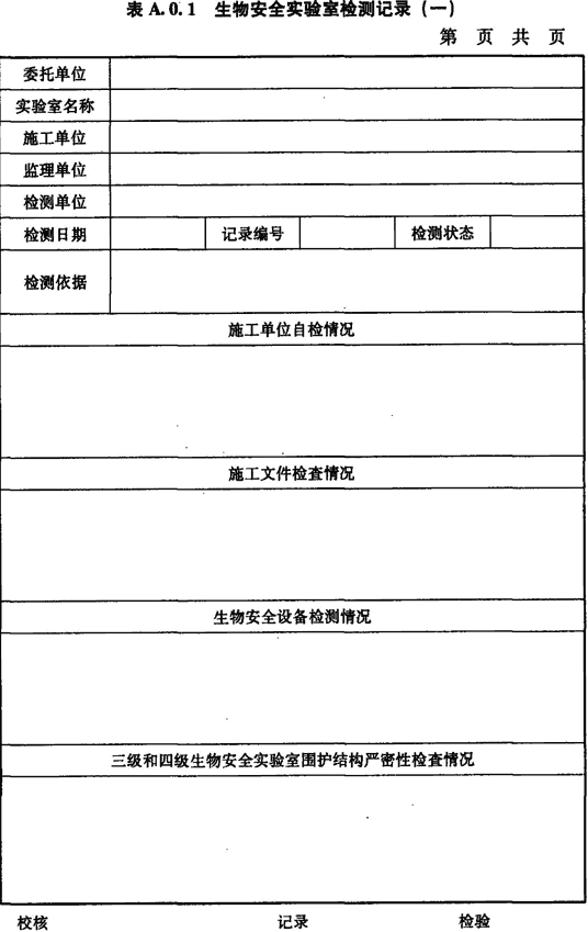 A.0.1 生物安全實驗室施工方自檢情況、施工文件檢查情況、生物安全柜檢測情況、圍護結(jié)構(gòu)嚴密性檢測情況應(yīng)按表A.0.1進行記錄。