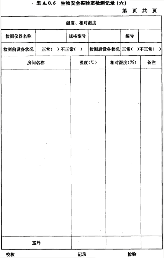 A.0.6 生物安全實驗室房間溫度、相對濕度的檢測應(yīng)按表A.0.6進行記錄。