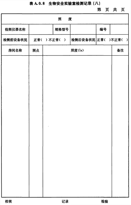 A.0.8 生物安全實驗室房間照度的檢測應(yīng)按表A.0.8進行記錄。