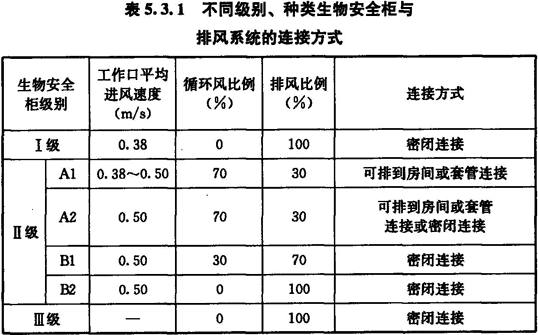 4 不同級別、種類生物安全柜與排風(fēng)系統(tǒng)的連接方式應(yīng)按表5.3.1選用。