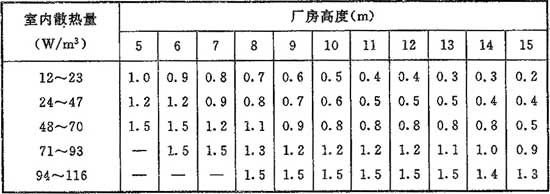 H.0.3 散熱量有效系數(shù)m值宜按相同建筑物和工藝布置的實(shí)測數(shù)據(jù)采用,當(dāng)無實(shí)測數(shù)據(jù)時(shí),單跨生產(chǎn)廠房可按下式計(jì)算:
