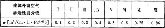 式中:α1——外門窗縫隙滲風系數(shù)[m3/(m·h·pab)],當無實測數(shù)據(jù)時,可根據(jù)建筑外窗空氣滲透性能分級的相關(guān)標準,按表F.0.3采用;